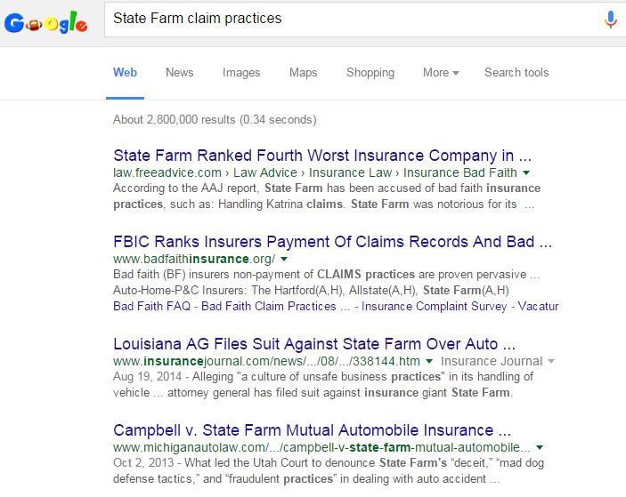 The time-honored business practice of “not speaking poorly of competitors” is one I understand and respect. To remove the appearance of bias and finger pointing, I encourage consumers to use the power of the internet to perform the above search for ANY insurance carrier. To illustrate the revealing insights that can be gained, consider just the first few results that appear in the screenshots below for a search on the two companies that insure more homes and cars than any other carriers in the United States.